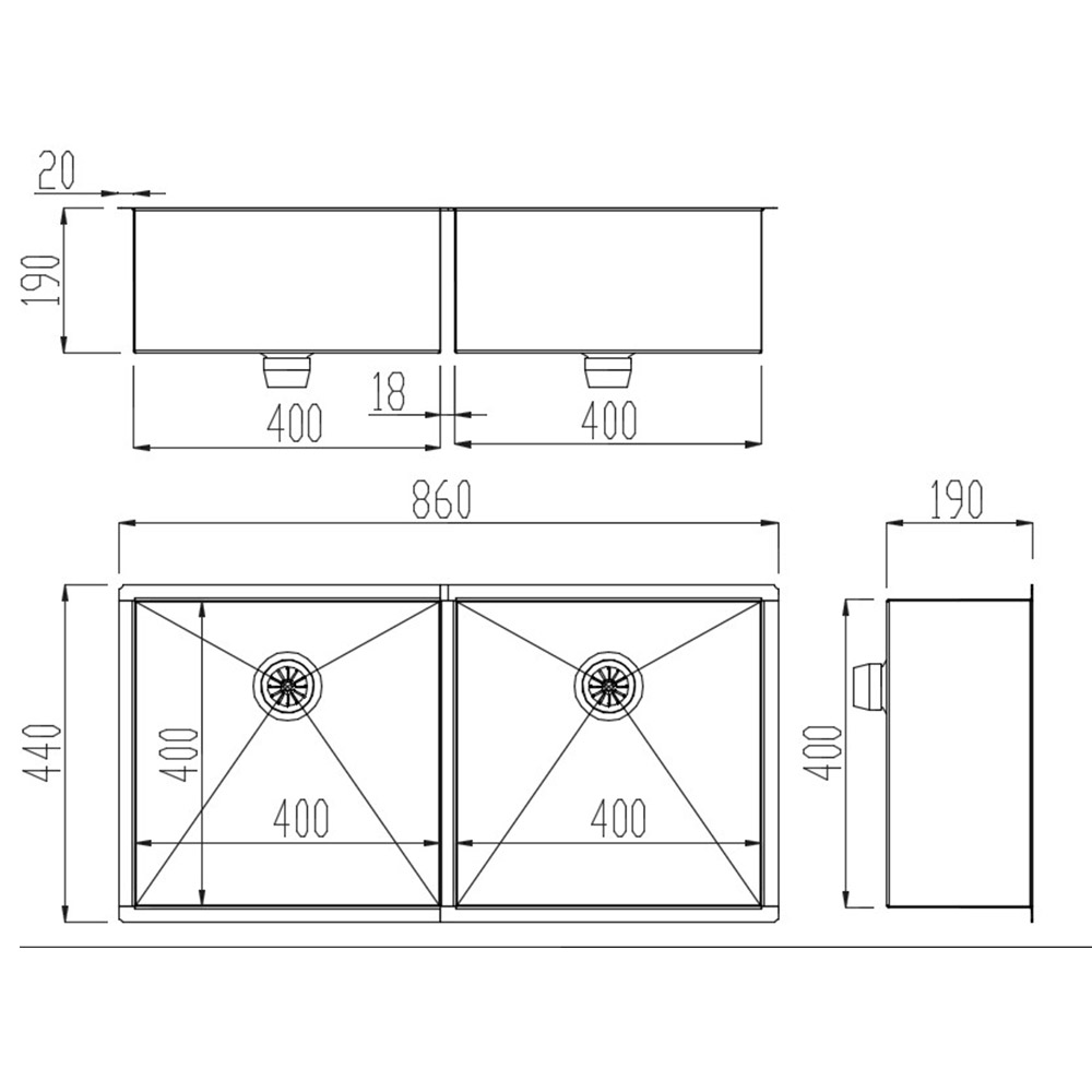 • Medida útil por cuba: 400x400x190 mm (CxLxA)